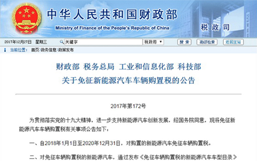 2017年12月27日,财政部、税务总局、工业和信息化部、科技部联合发布关于免征新能源汽车车辆购置税的公告。公告指出,为进一步支持新能源汽车创新发展,自2018年1月1日至2020年12月31日,对购置的新能源汽车免征车辆购置税。有政府部门带头,中国新能源车产业将持续走强,汽车工业也将由大变强。 [ 详 细 ]